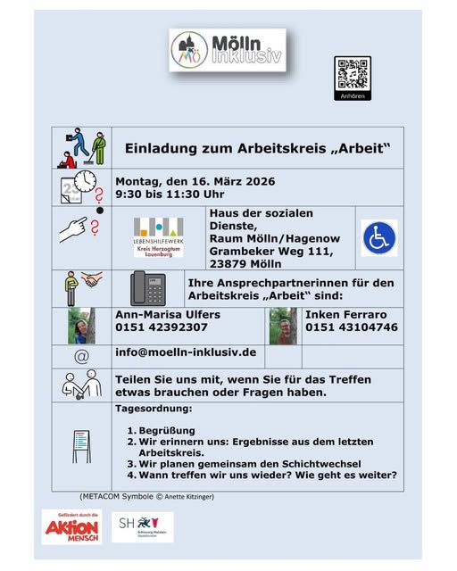 Der Arbeitskreis findet am 16.03.2026 in der Zeit von 9.30 bis 11.30 Uhr im Haus der sozialen Dienste im Raum Mölln/Hagenow, Grambeker Weg 111, in Mölln statt. Das Gebäude ist rollstuhlgerecht.