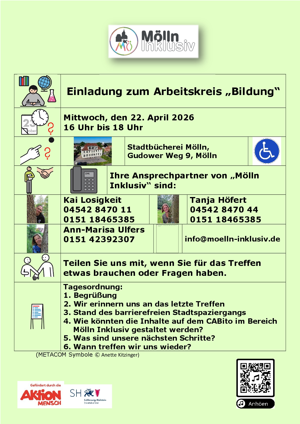 Der Arbeitskreis findet am 22.04.,2026 in der Zeit von 16.00 bis 18.00 Uhr in der Stadtbücherei Mölln, Gudower Weg 9, in Mölln statt. Der Zugang ist rollstuhlgerecht.