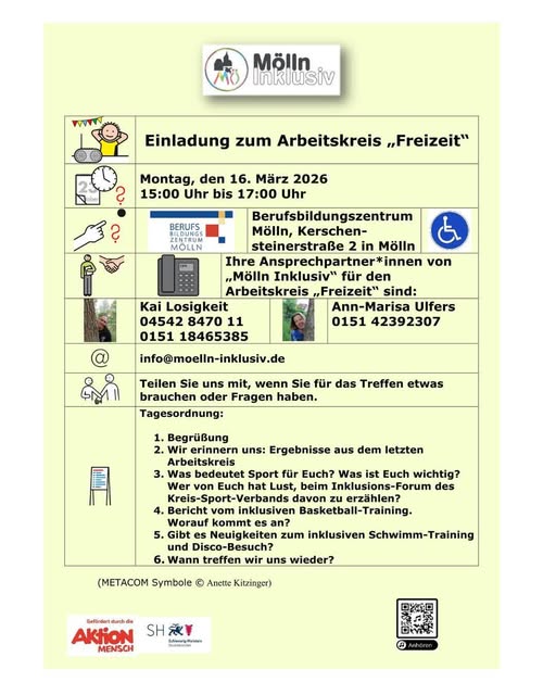 Der Arbeitskreis findet am 16.03.2026 in der Zeit von 15.00 bis 17.00 Uhr im Berufsbildungszentrum Mölln, Kerschensteinerstrasse 2, in Mölln statt. Der Zugang ist rollstuhlgerecht.